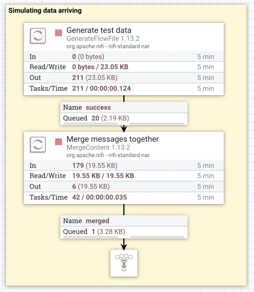 Now connect those 2 processors together and we are done with the traffic simulation. Remember, in reality you wouldn’t need this bit, it’s just for testing purposes. In the screenshot below you can see I have connected the Success relationship from the GenerateFlowFile to the MergeContent. Then I have connected the Merged relationship from the MergeContent to a funnel. The funnel is just so we can test this part of flow now and we will delete it later. I wrap the processors in a Label block to help make the flow easier to understand.