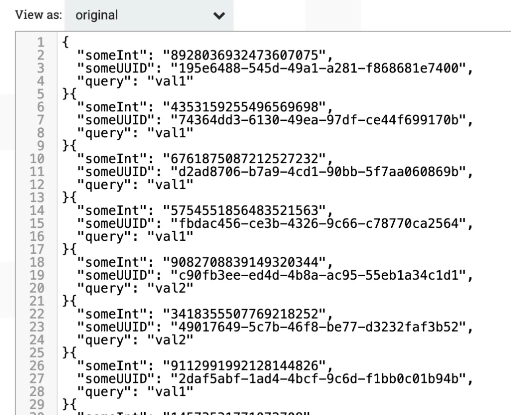 Where someInt is a random number, someUUID is a random UUID string and query is one of either val1 or val2.