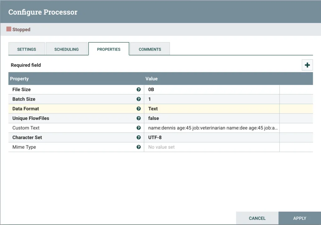 First, add a GenerateFlowFile processor. Weāll use this to generate our sample data. Configure the processor as follows: