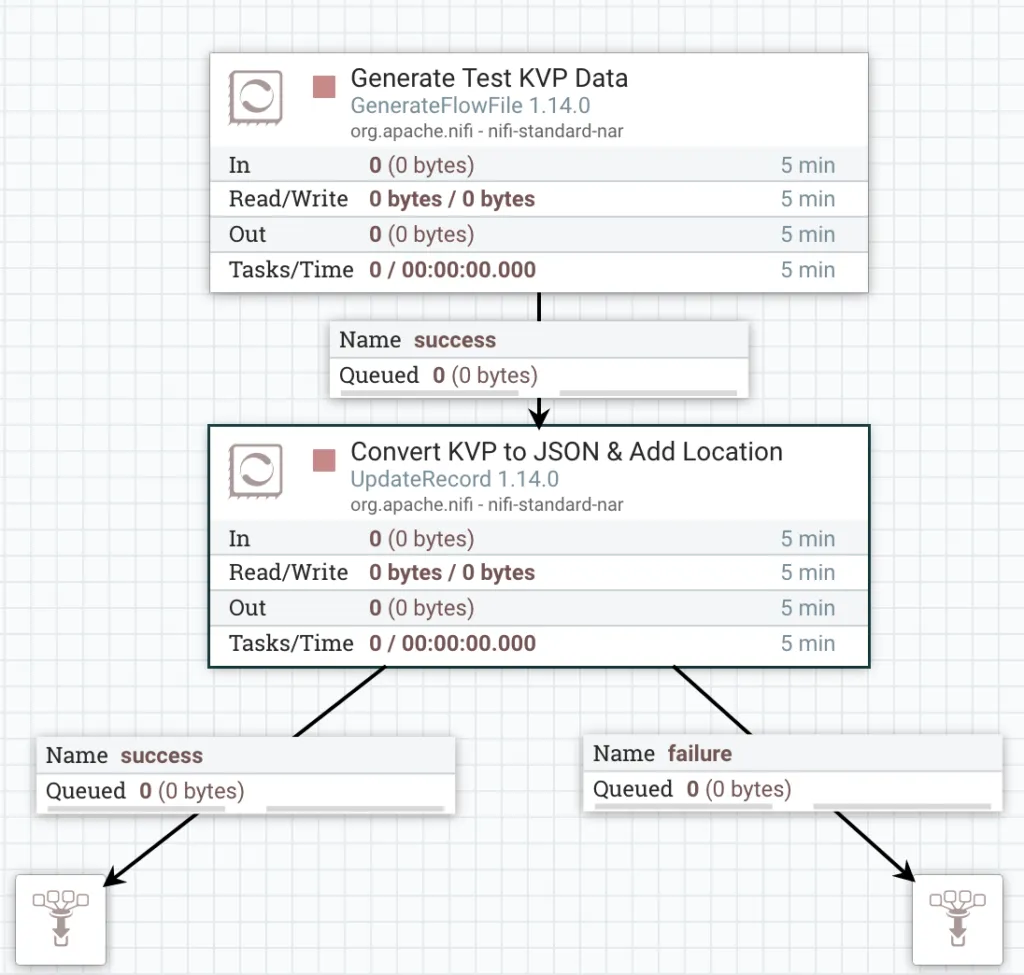 Next, drag on two Funnels. Now connect the GenerateFlowFile output to the UpdateRecord, then connect the UpdateRecordās failure relationship to one Funnel and the success relationship to the other Funnel.