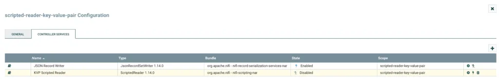 Save this config, and enable both the ScriptedReader and JsonRecordSetWriter by clicking the Enable button.