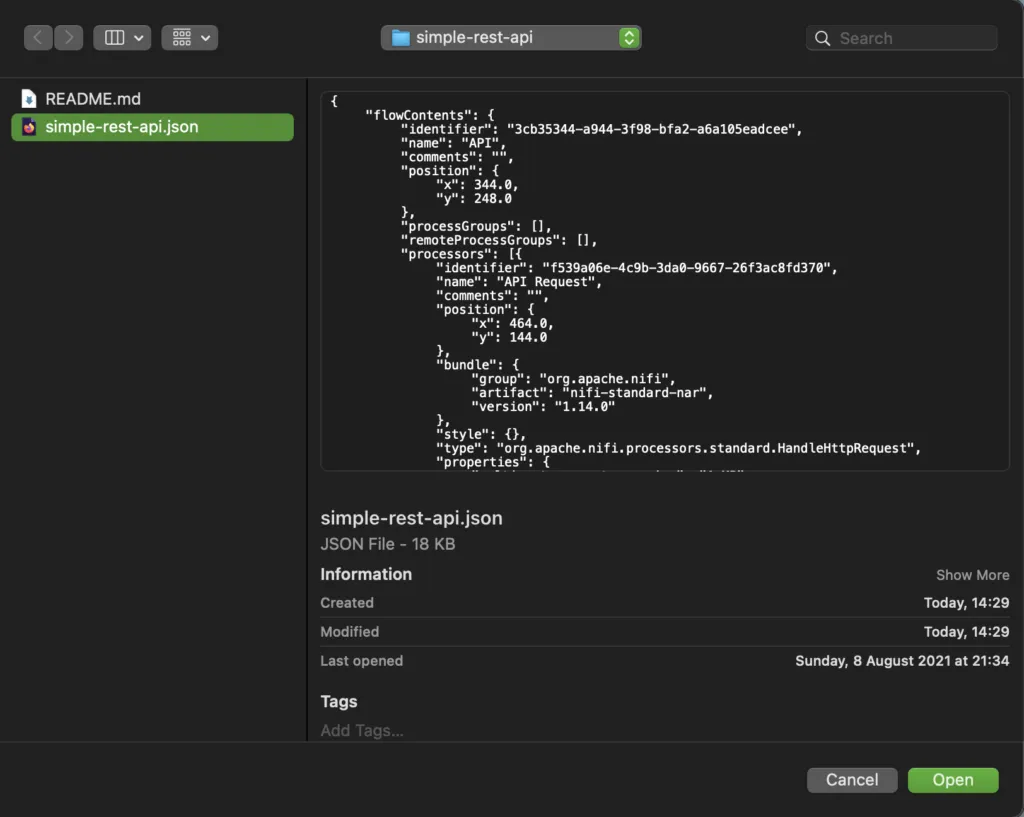 This will open a file browser to let you select a flow definition to import. Navigate to the clones git repo and select the json file to upload - I will upload the simple-rest-api flow by selecting simple-rest-api.json and hitting Open.
