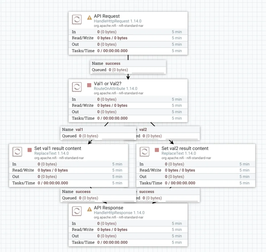 Note: importing a Flow Definition does not enable the controller services, so in this case the HandleHTTPRequest and HandleHTTPResponse processors have invalid config warnings.
