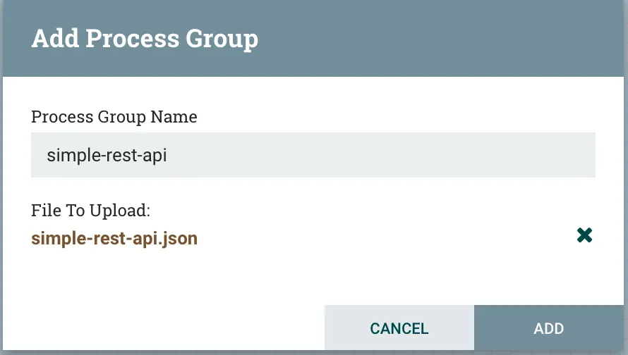 This will open a file browser to let you select a flow definition to import. Navigate to the clones git repo and select the json file to upload - I will upload the simple-rest-api flow by selecting simple-rest-api.json and hitting Open.