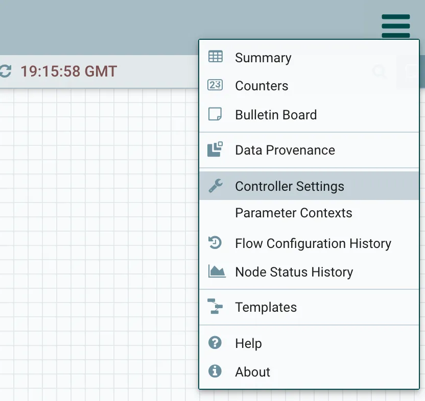 Now, in our Dev NiFi, we need to connect to Registry. Go to the burger menu in the top right and click Controller Settings.