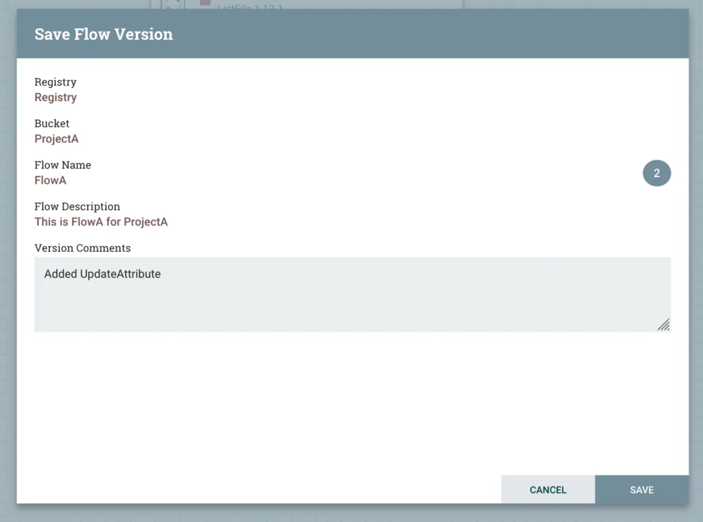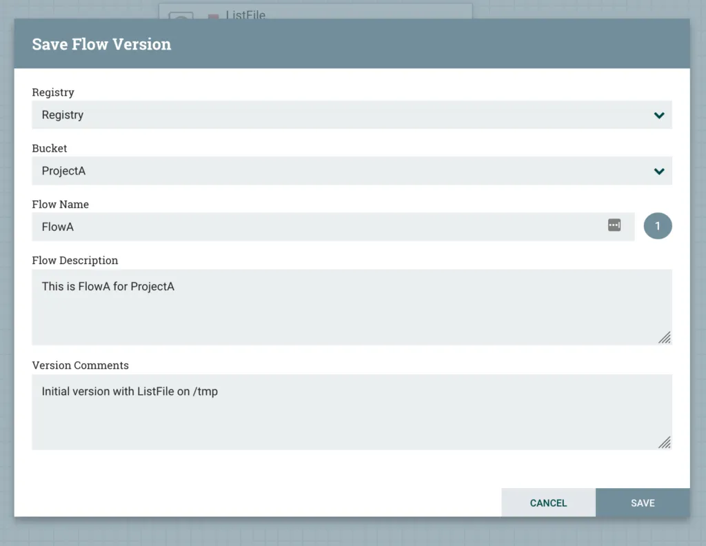 We get a dialogue box to provide details. Select the Registy client and the Bucket we created earlier. Provide a name for the saved flow. A description can be given to describe the flow, and this is not changed between versions. You can also provide Version Comments, similar to a commit message, which can be given with each new version.