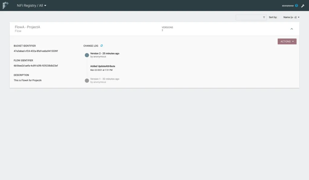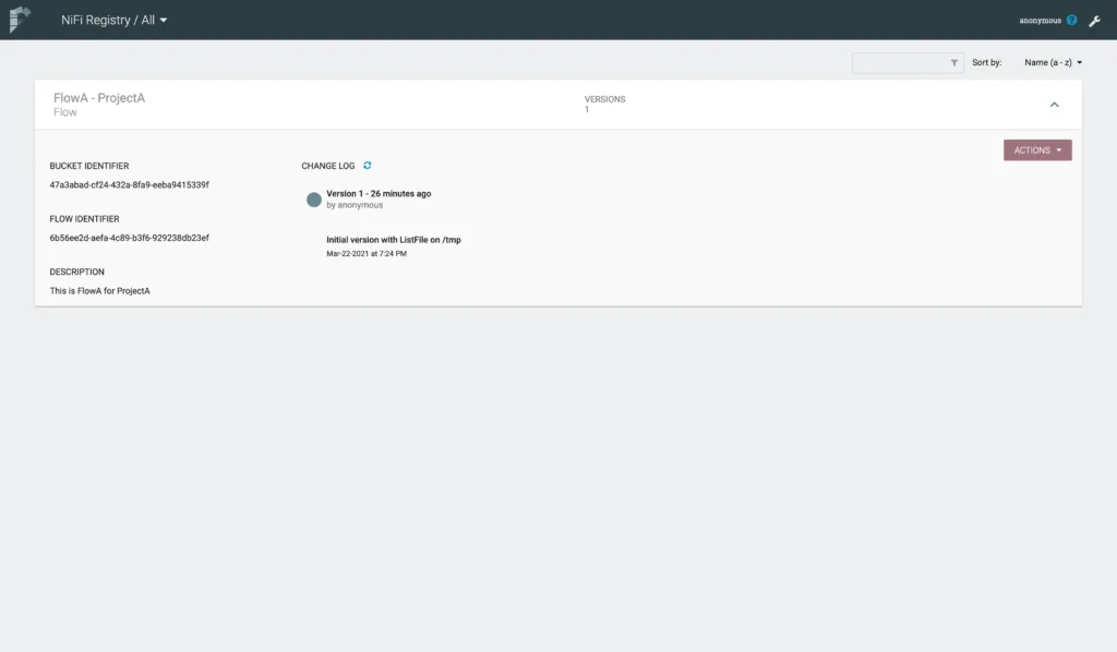 Back in NiFi Registry, we can see the flow is shown with various details.