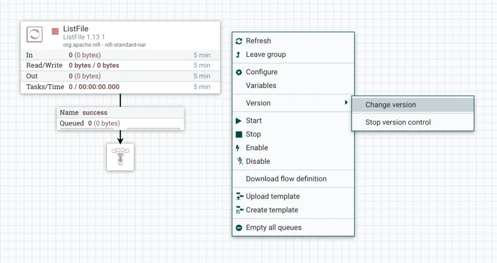 Inside the process group, we can see the flow is still the original version. To upgrade, we can right click the canvas background, go to Version and then Change Version.