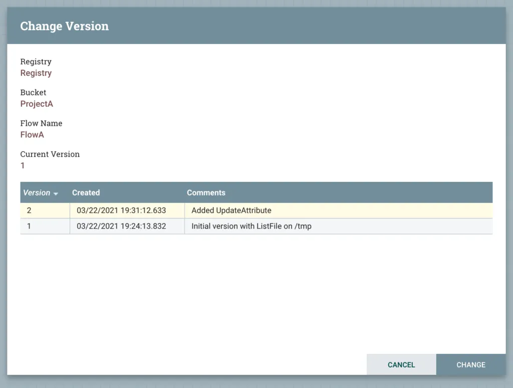 Back in NiFi Registry, we can see that our flow has another version.