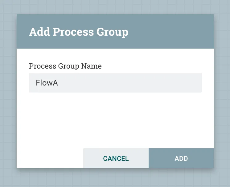 Go back to the Root canvas in NiFi and drag on a new Process Group. I will call mine FlowA.