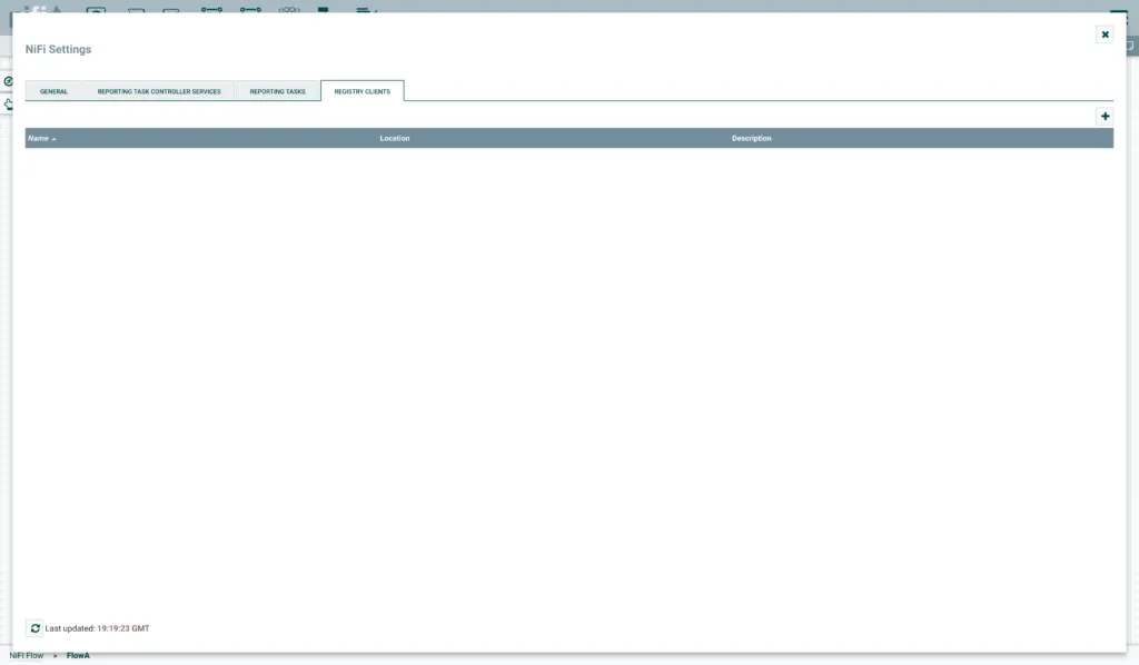 Firstly, we see a blank registry with no buckets or flows. We click the Spanner icon in the top right.