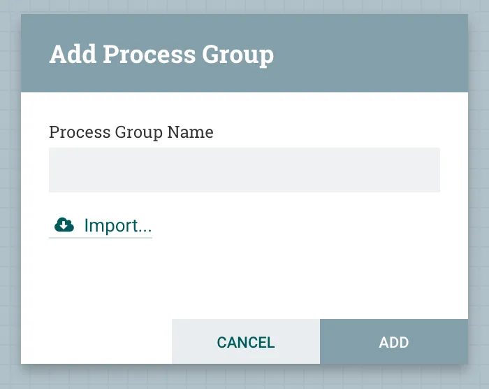 Now, in our Prod NiFi, complete the same steps as above to add the Registry client. Once done, go to the Root canvas and drag in a new Process Group. This time, click the Import link in the dialogue box.