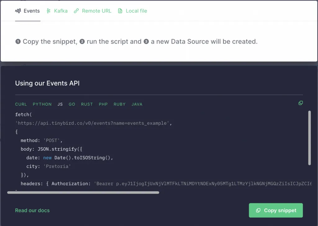 The URL for the fetch request will look something like https://api.tinybird.co/v0/events?name=events_example. Notice the name=events_example? This will become the name of your data source, so feel free to change the name to anything you want, I’ve called mine just events.