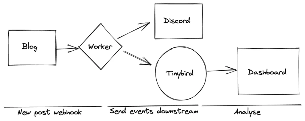 To do this, I needed a custom webhook; when I publish a new post on my blog, instead of calling the Discord webhook, I call my own webhook, which will both send the event to Tinybird, and then call the Discord webhook. I don’t want to manage a server running this, and I also don’t want to pay much (or anything) for it. For this, Cloudflare’s Workers are a perfect fit, with absolutely 0 management overhead, and a generous free tier that is more than I need.