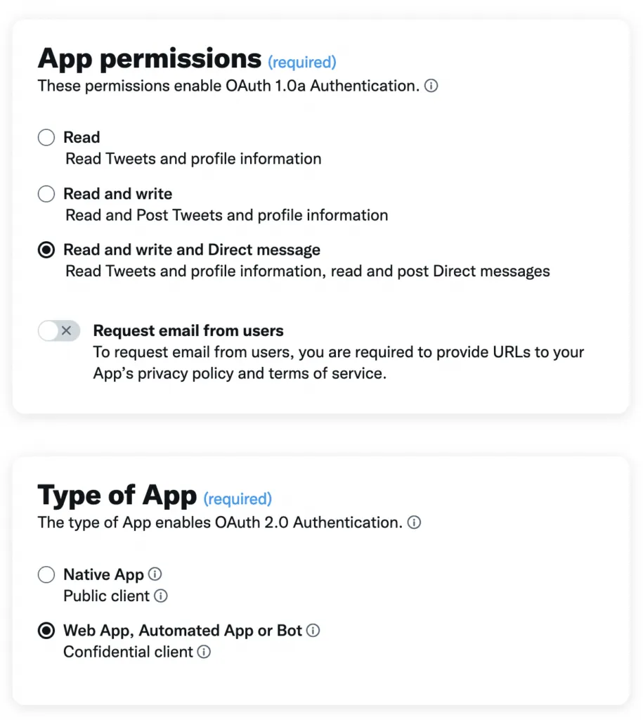 At the bottom of the Settings page there is the User authentication settings section. You need to enable user authentication (OAuth2.0) to use the Account Activity API. Enter the user auth setup, and you should see a form that looks like the screenshot below. For App permissions you want to tick Read and write and Direct message, and for Type of App you want to tick Web App, Automated App or Bot.