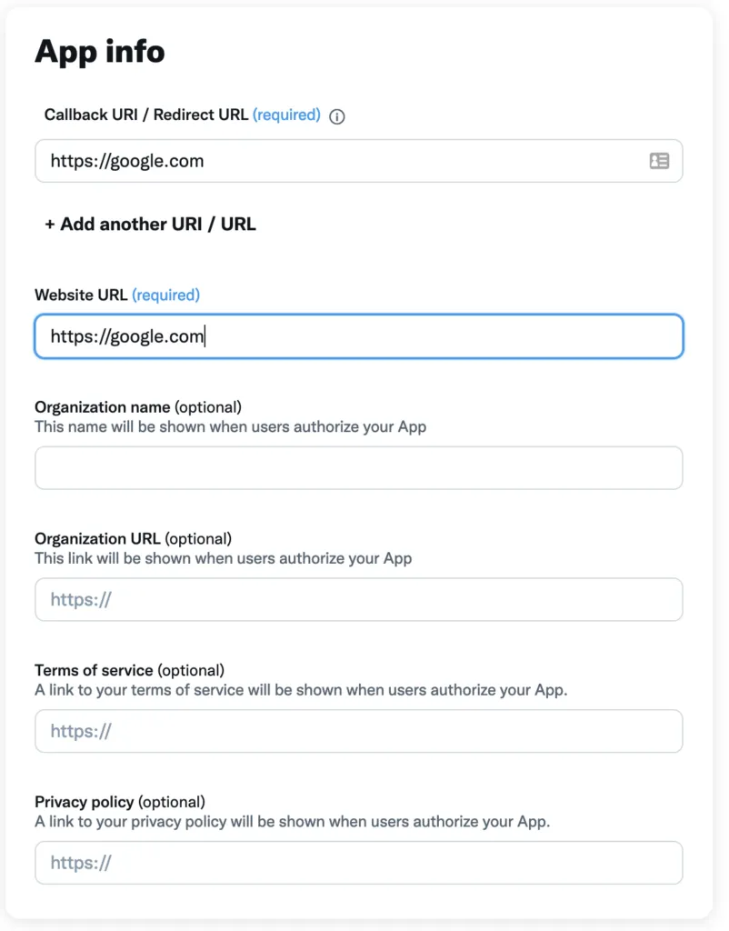 Below this you will have a form asking for URLs. For now, just add https://google.com as the Callback URI and Website URL values.